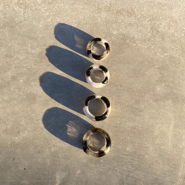 クリア部分には、ゴールドのガラスを。 ココアカラーとベージュをバランスよく混ぜることで 美しいマーブル模様を鼈甲のように表現しました。 クリア部分が透けるため、秋冬だけでなく、 オールシーズン使えます。 リングは太めのデザインのため、 小さく感じやすいです。 そのため普段お使いのサイズよりも すこし大きめを選んで頂くと きつくなく、丁度いいサイズでご使用いただけます。 また、いびつなデザインにすることで 抜け落ちにくくなっております。 すこし大きくても落ちにくく、 使い勝手がいいです。 こちらは10号の型を使用しておりますが デザイン上、9号に近い状態です。