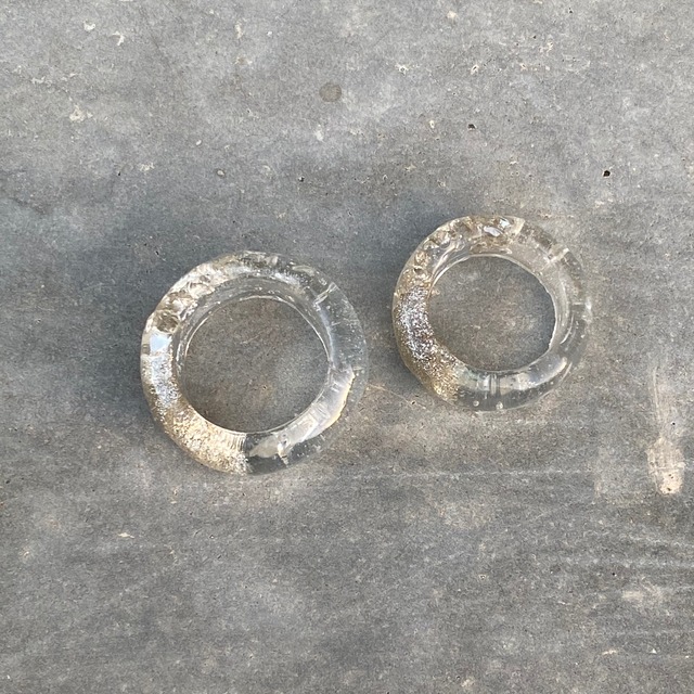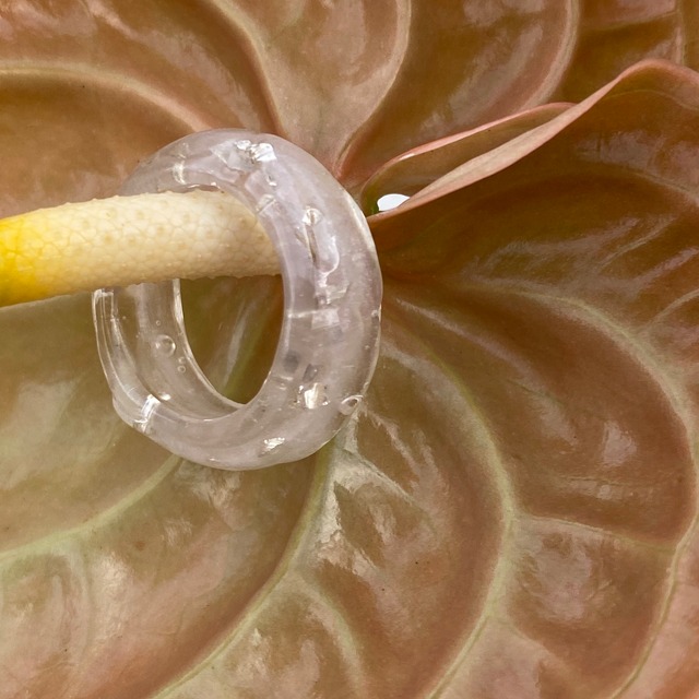 たっぷりとシルバーのラメを使ったクリアリング 夕日に照らされると ゴールドに見えちゃう不思議なリング 時間帯によっていろんな表情をたのしんで♡ お手持ちのリングとも合わせやすい シンプルかつ存在感のあるアイテム ポッテリつやつやが、他にはない アンニュイな雰囲気を作ってくれます ニュアンスのある形なので はっきりしたサイズは図れませんが サイズは16〜15号 となっております。 硬く太さのあるリングで伸縮性はないので 普段お使いのサイズよりも少し大きめのほうが 抜け落ちず、余裕もあるちょうど良いサイズです。 男女ペアで使うのも、オススメ♡
