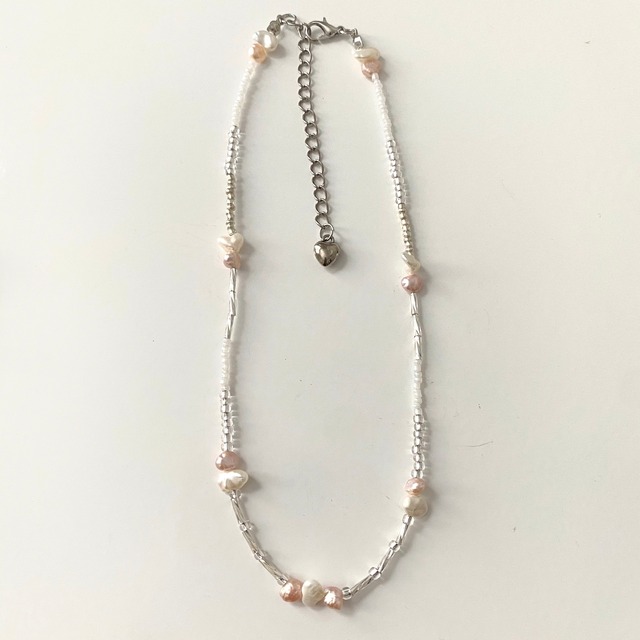 ピンクの淡水パールと ホワイトの淡水パールをアクセントに、 ホワイトとシルバーとクリアカラーの ビーズを組み合わせたネックレスです。 パールの上品さとビーズのカジュアルさの ミックスがとってもおしゃれなアイテム♡ いちごみるくを連想させるカラーが 女の子らしさMAXで 長さが調節できるので重ね付けにも◎ エンドパーツにも、ビンテージハートが付いているので 後ろから見ても可愛いネックレスです おしゃれ上級者さんは、ぜひ後前を逆にして 前にハートがぶら下がるようにつけてみてください♡ セクシーかつラブリーに着こなせます!