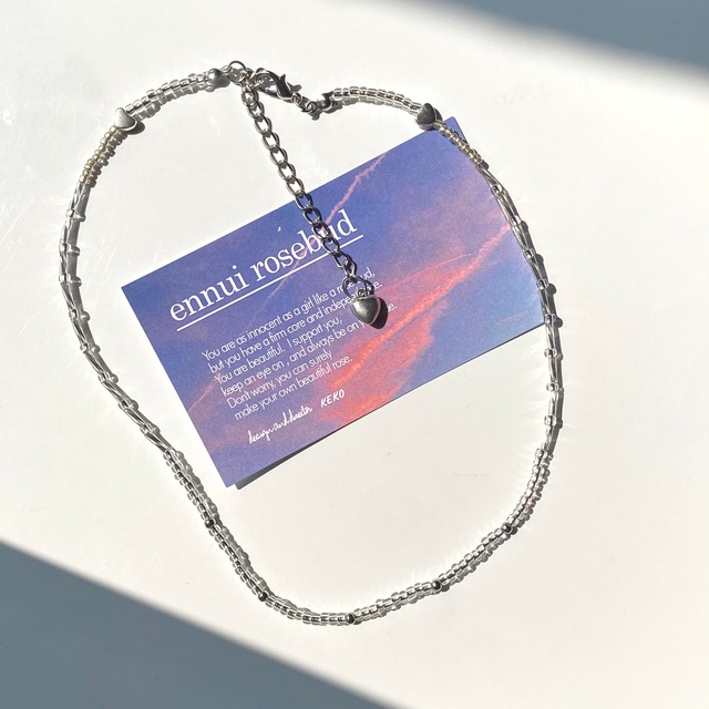 さりげないハートが たくさん散りばめられた 可愛らしくもシンプルなネックレス。 シルバーとクリアのビーズを組み合わせて 透明感と反射を活かしたデザインになっています。 ハートがシルバーなので 甘くなりすぎずにお洒落に着こなせます。 アップヘアや、ショートヘアのときに 後ろから見ても可愛くみえるように 調節部分にビンテージハートのパーツがついています。 お洒落上級者さんはぜひ ハートをフロント部分に持ってきて 前後ろ逆で付けてみてください♡ セクシーに着こなせます。 長さ調節が可能なので、 お待ちのネックレスと重ね付けも自由自在! 一点は持っておきたいビーズアイテムを お洒落に、他の人と差をつけましょ♡