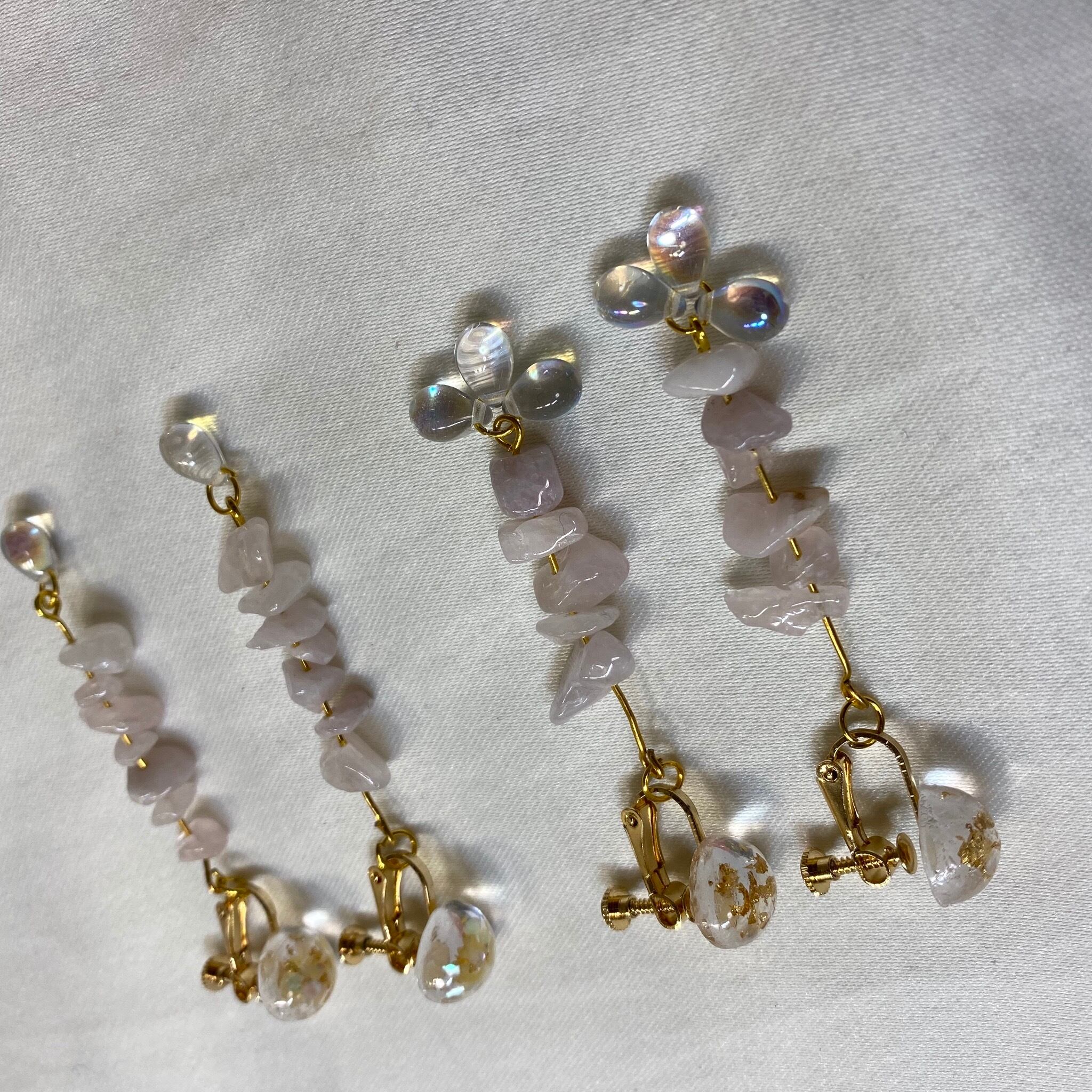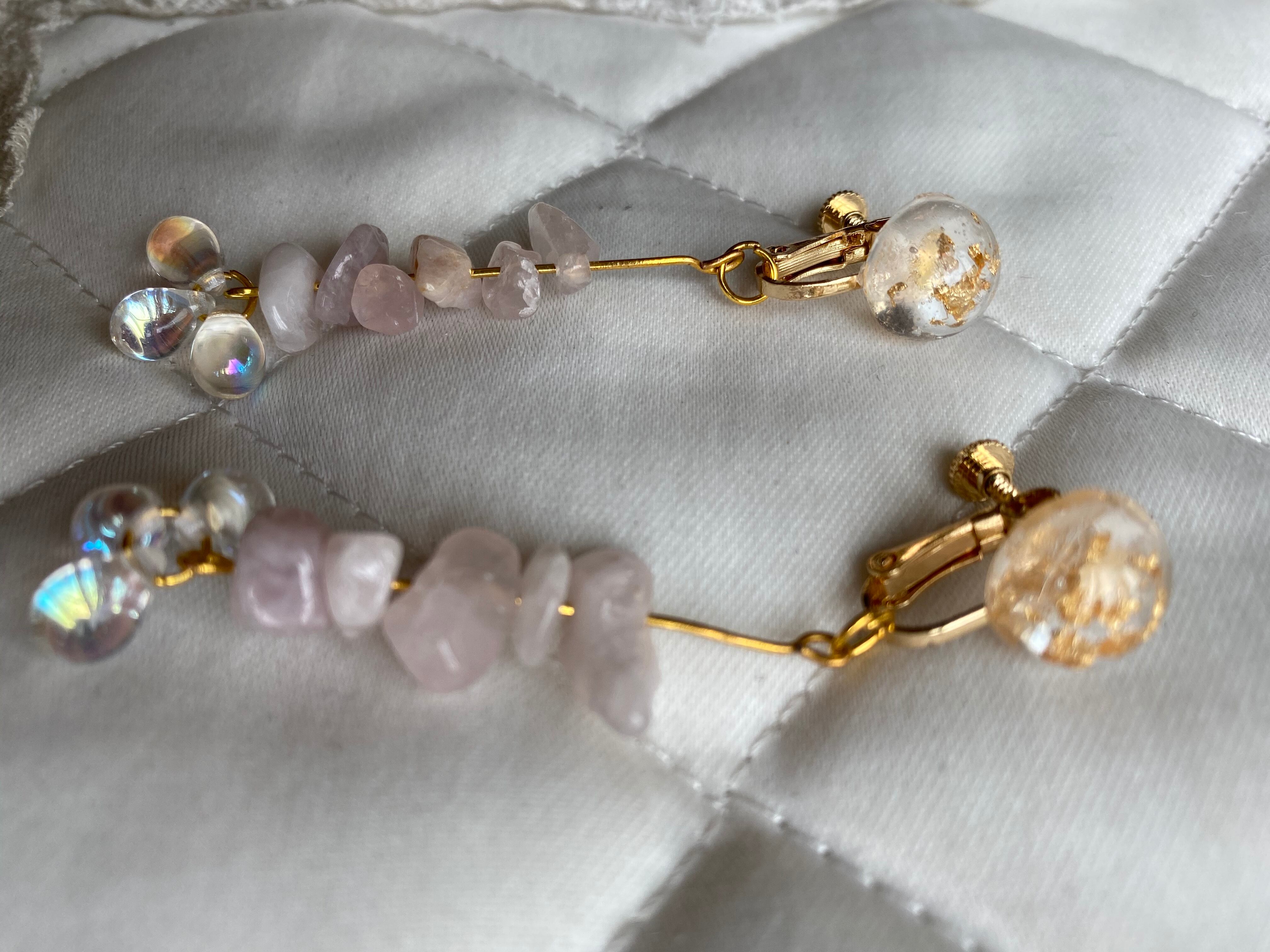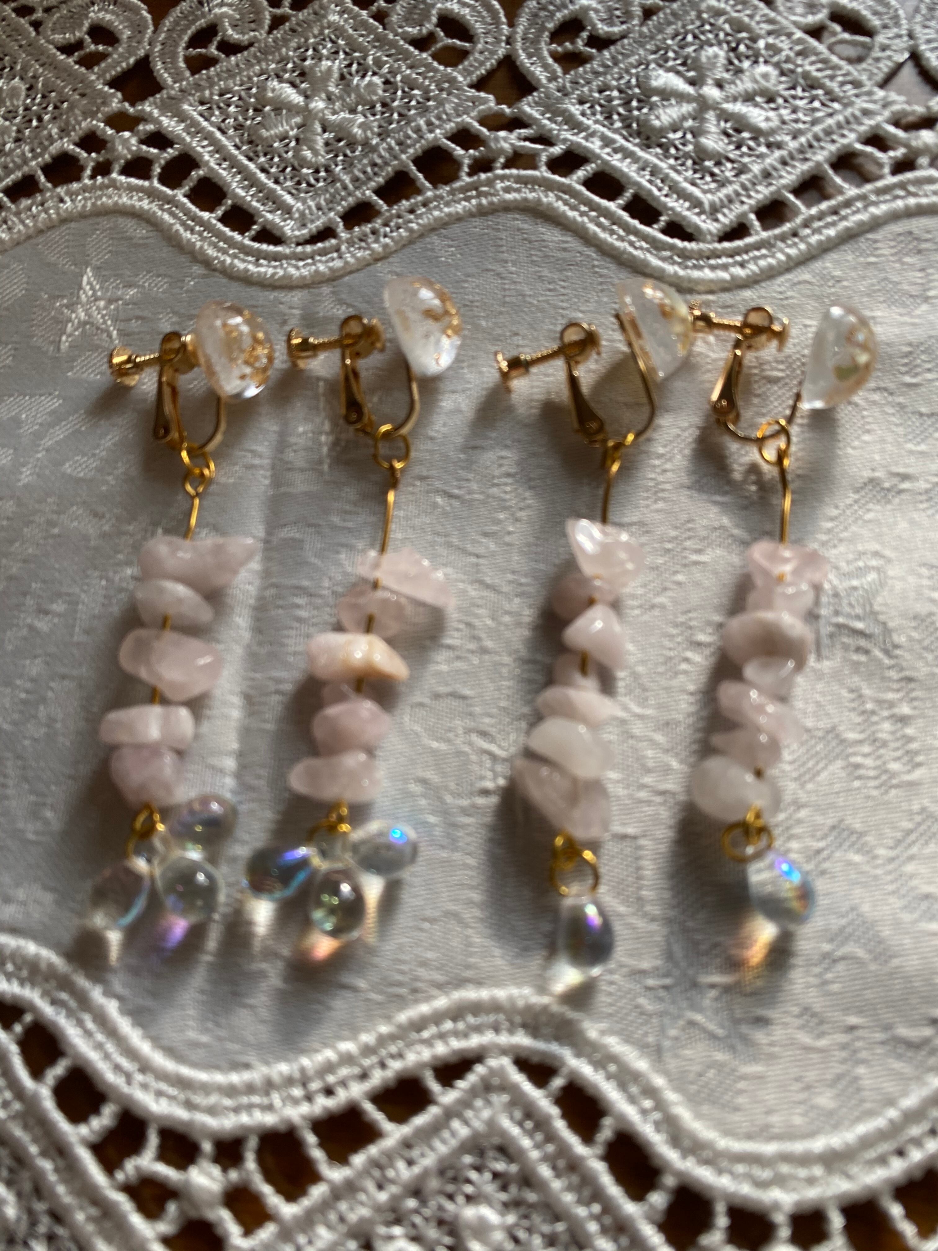 アメリカで仕入れた、薄ピンクの天然石をふんだんに使ったイヤリングです。