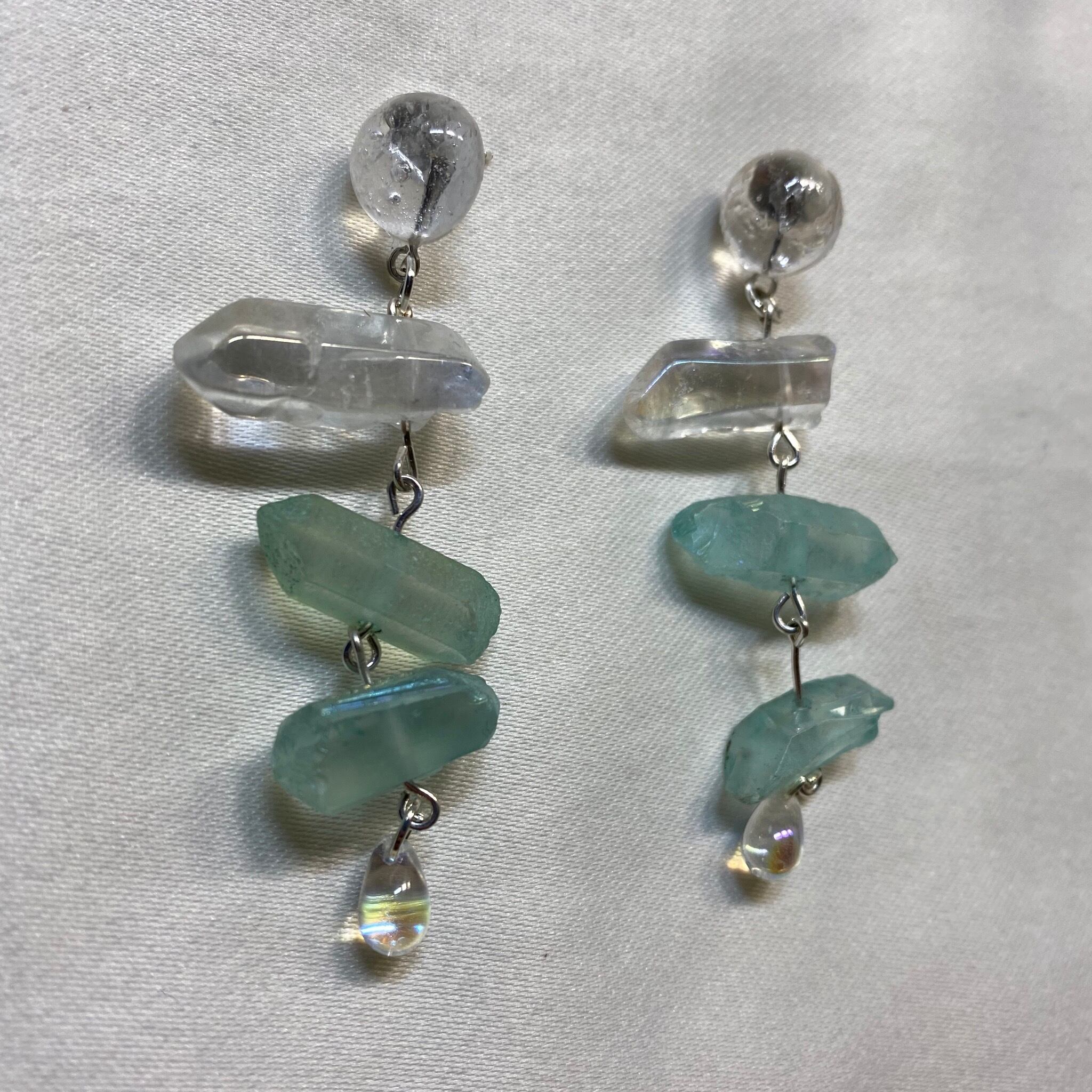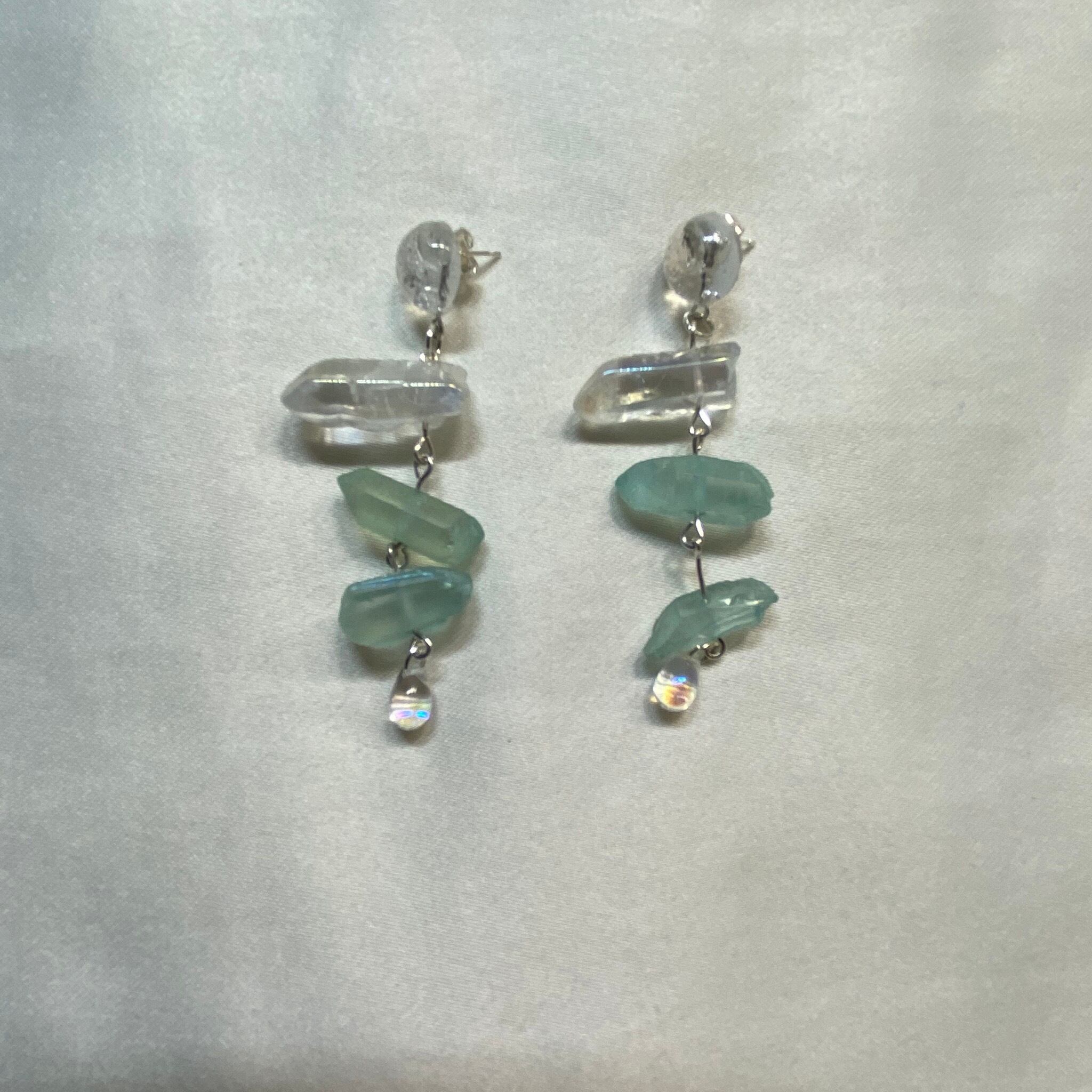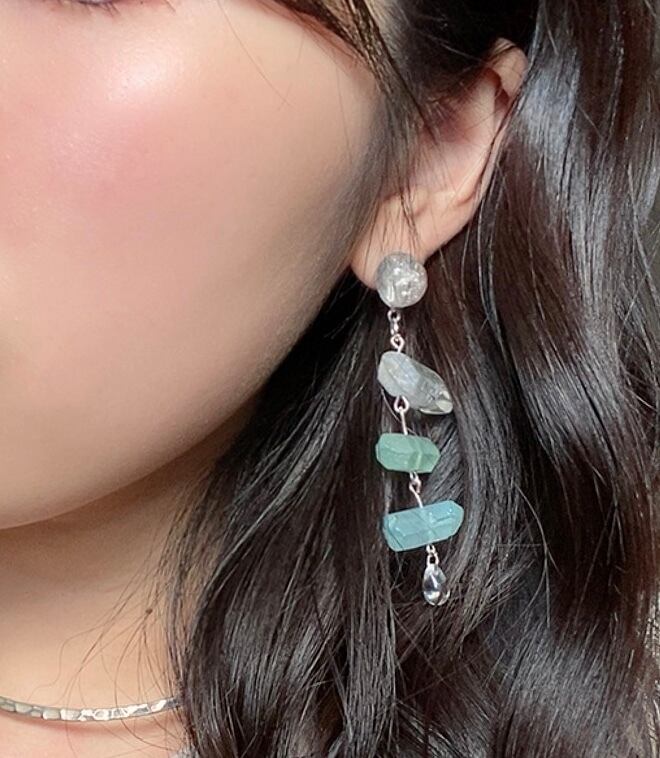 クリアとミントカラーの天然石を組み合わせた3連ピアスは、涼しさと透明感で満たされた気持ちになります。