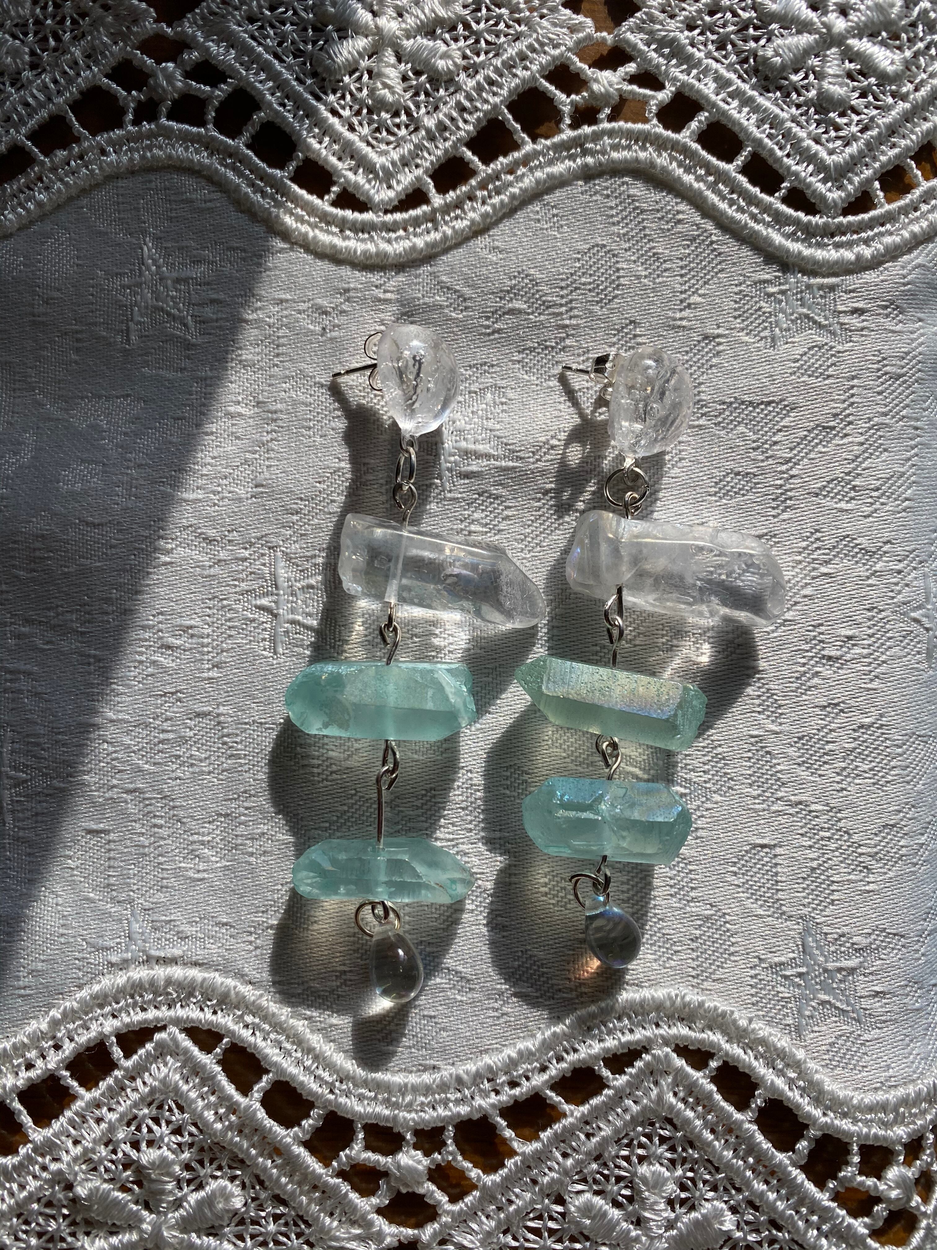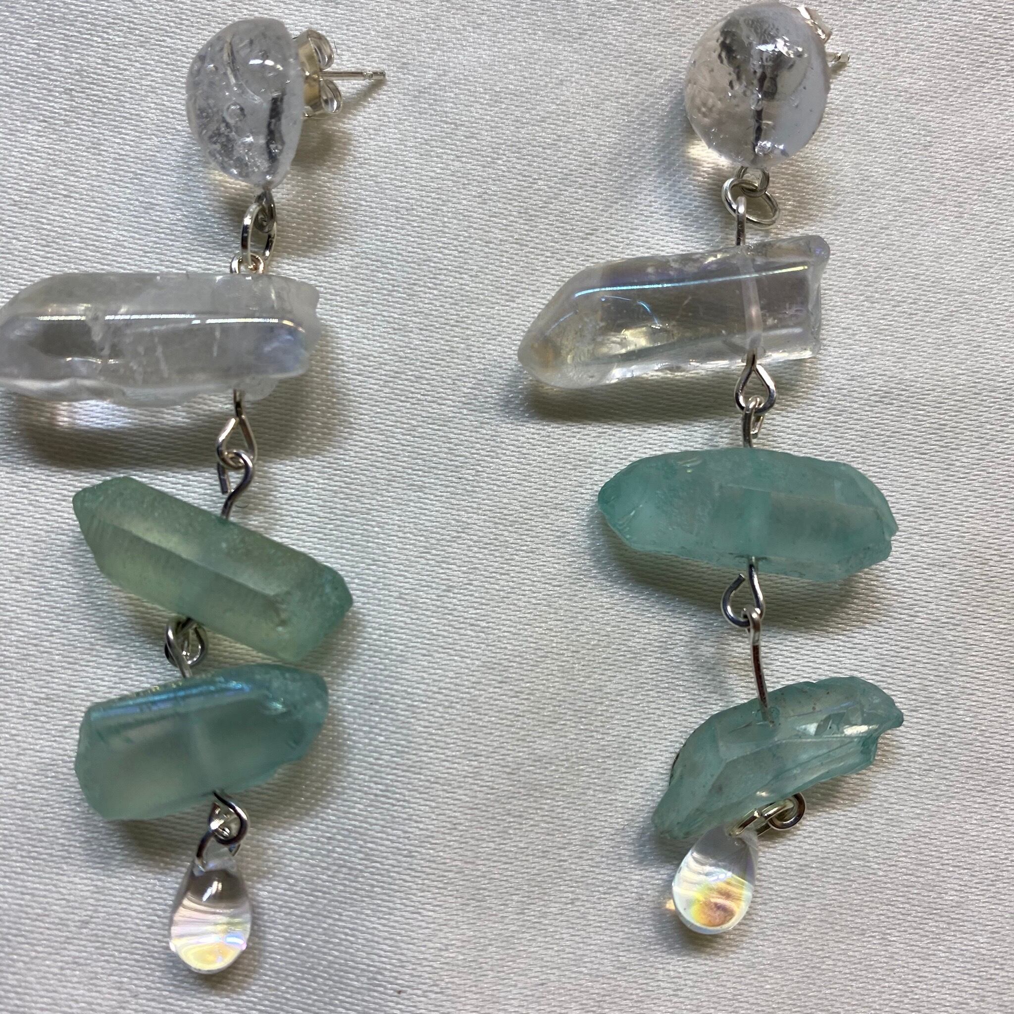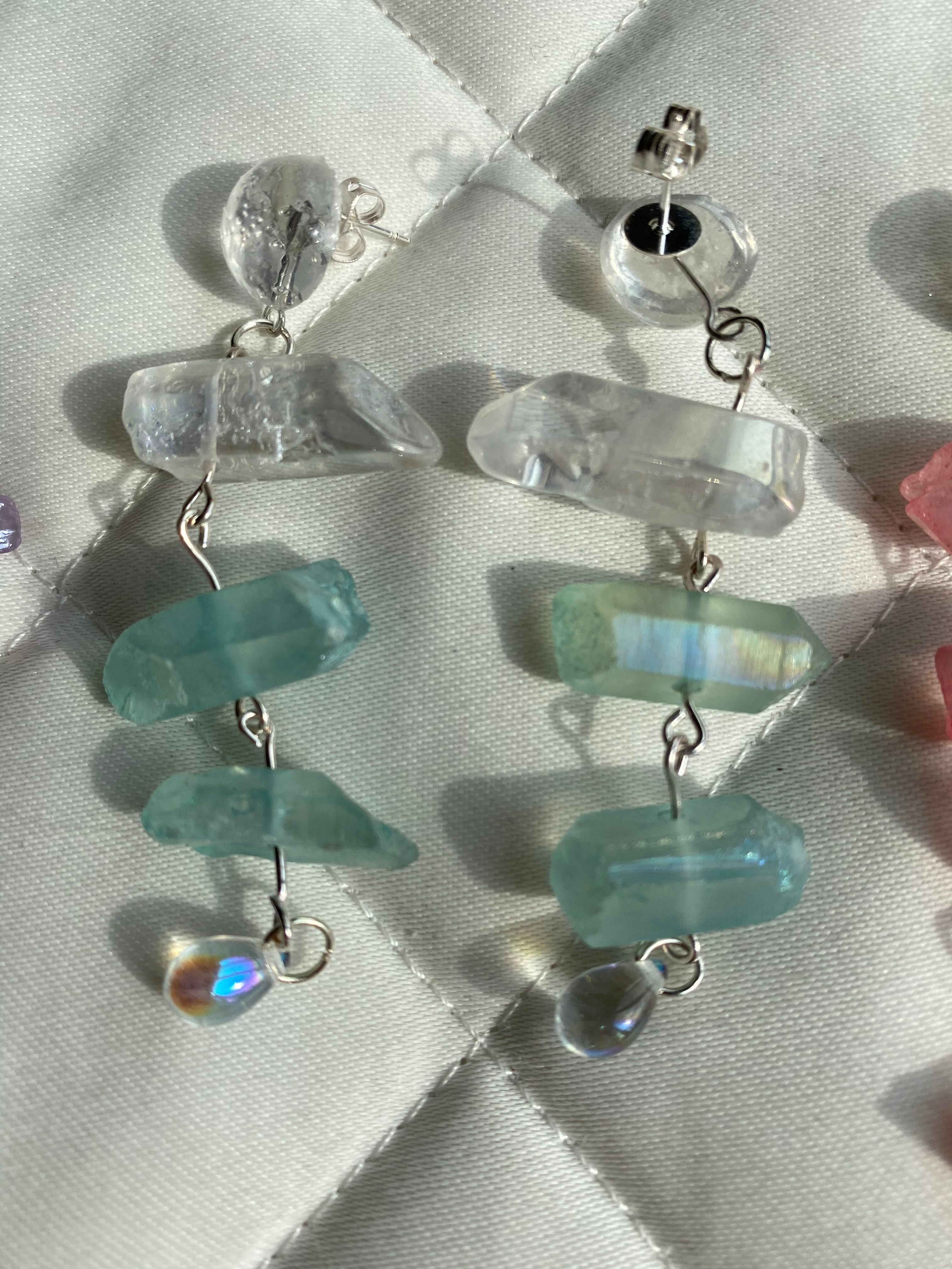 クリアとミントカラーの天然石を組み合わせた3連ピアスは、涼しさと透明感で満たされた気持ちになります。