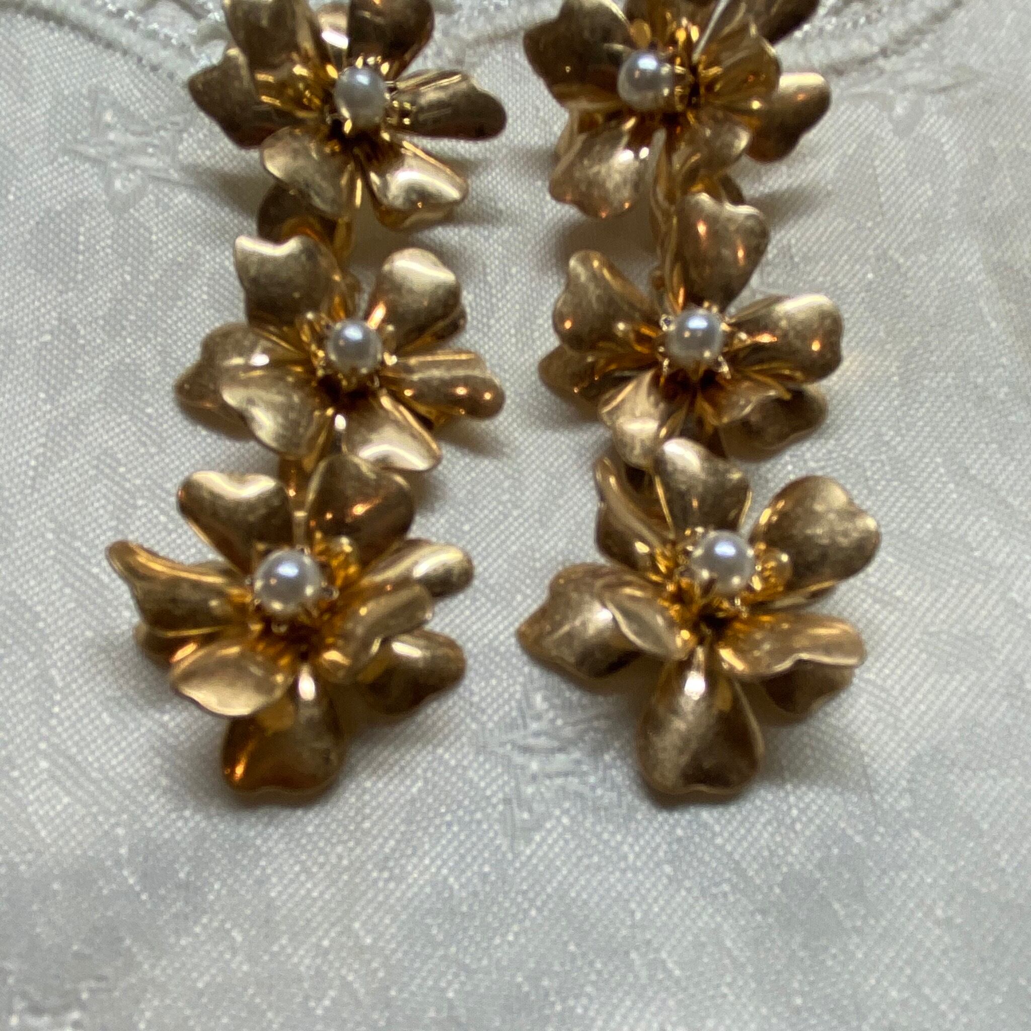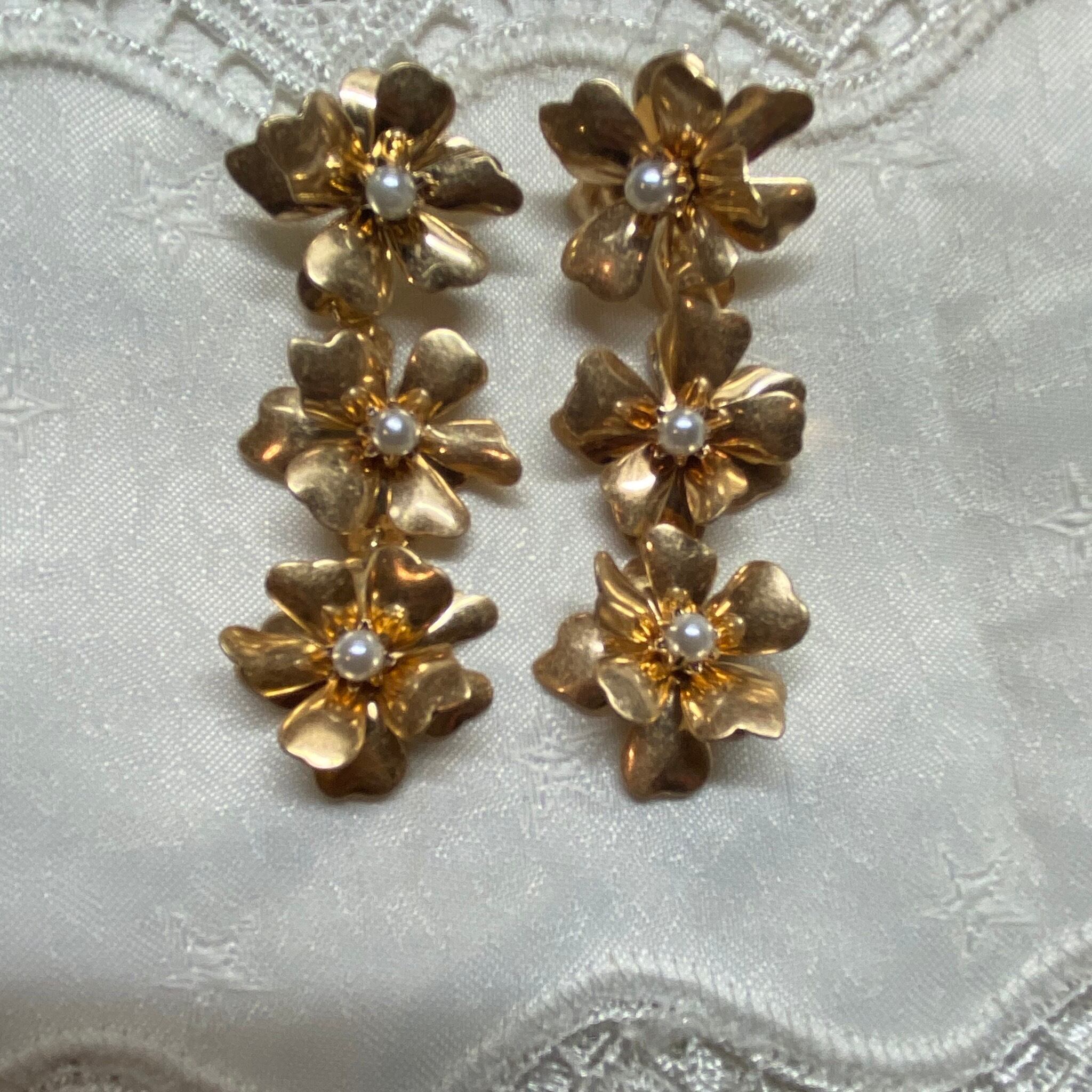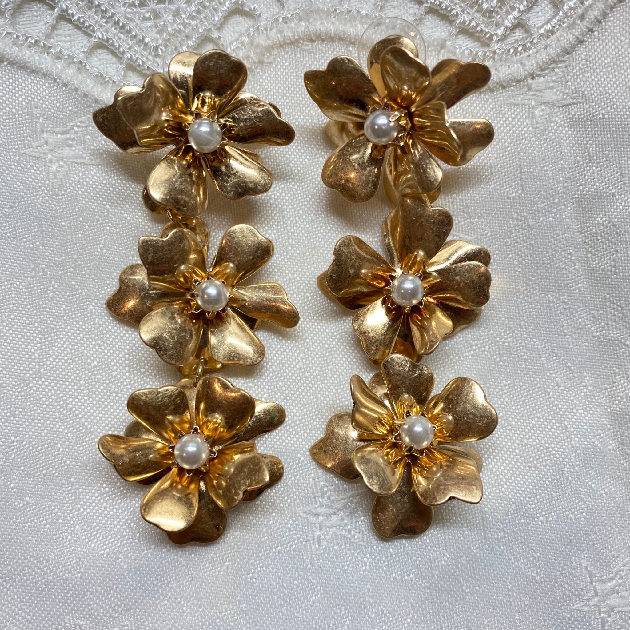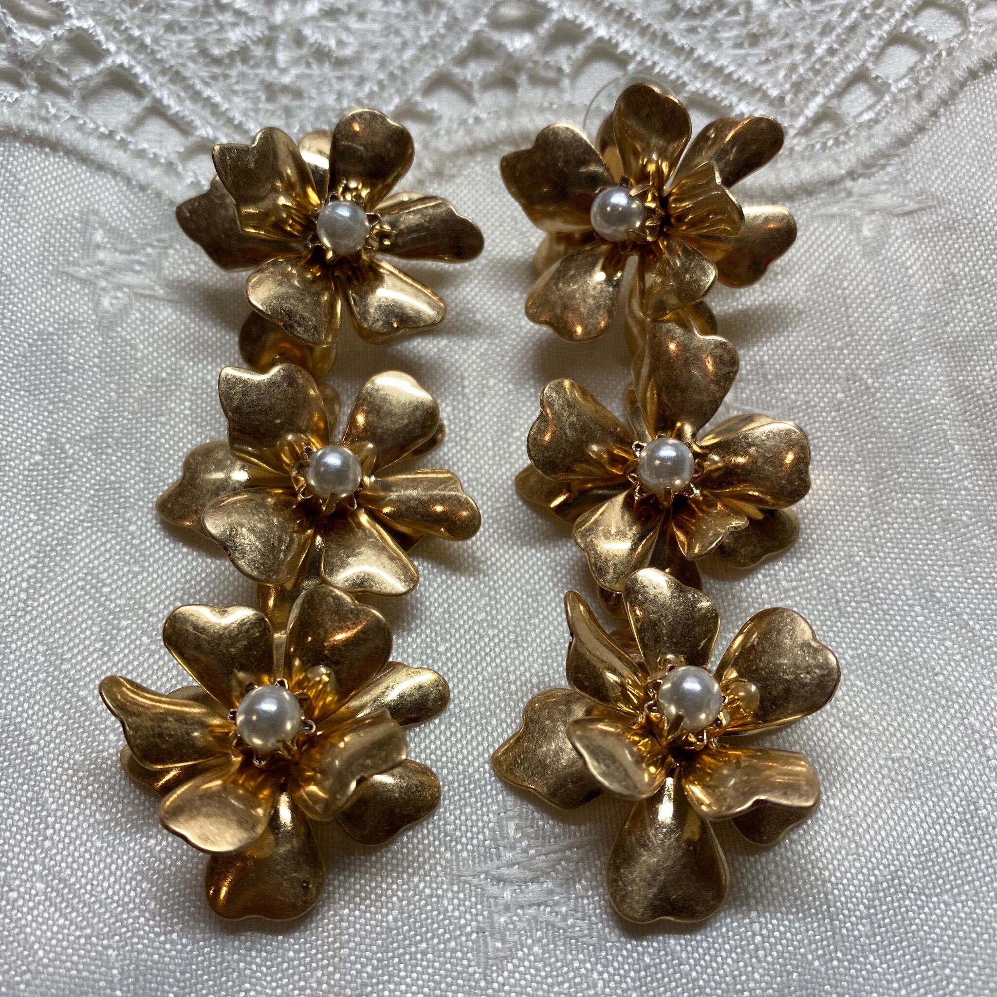 ビンテージ感のあるゴールドのフラワーが3連になったピアスです。