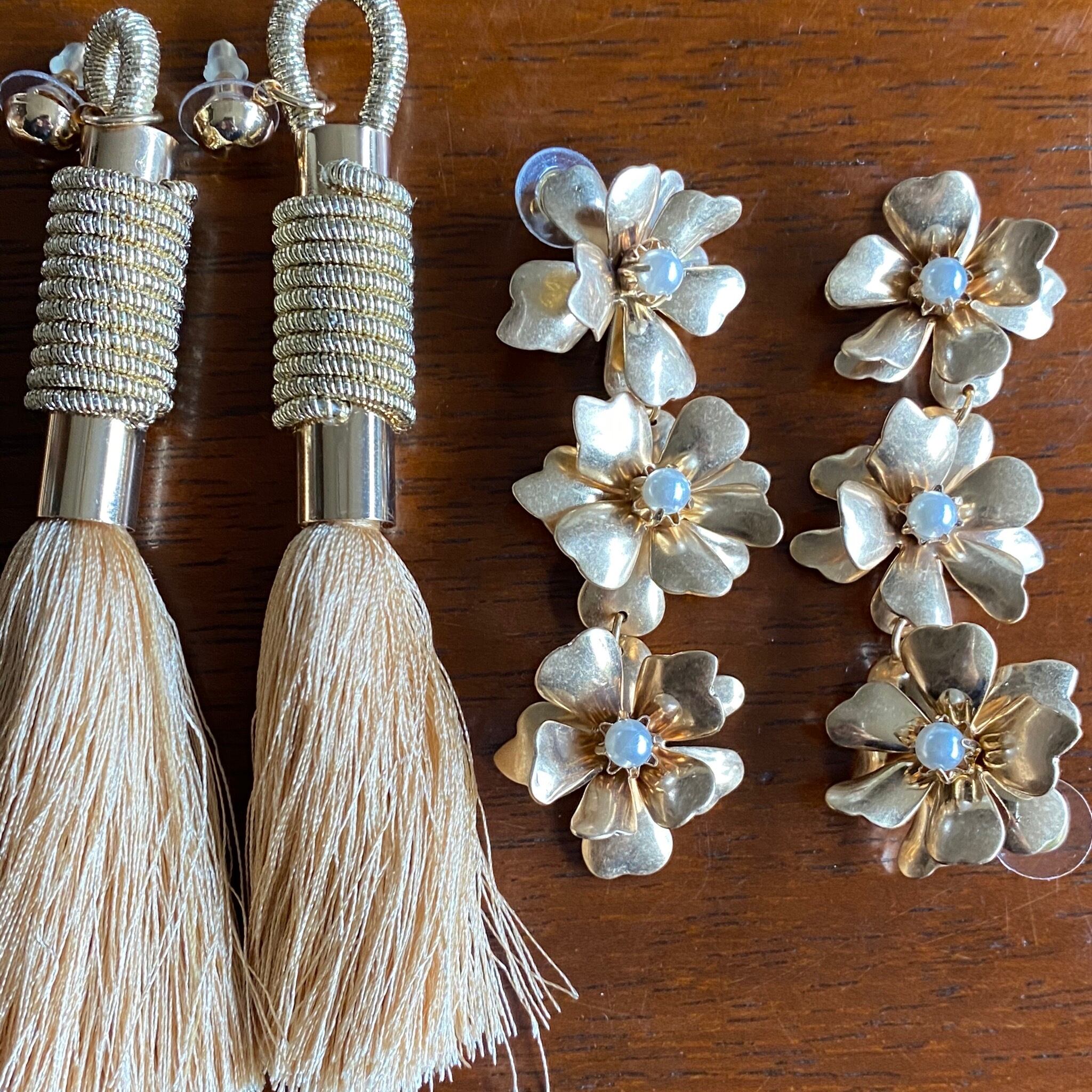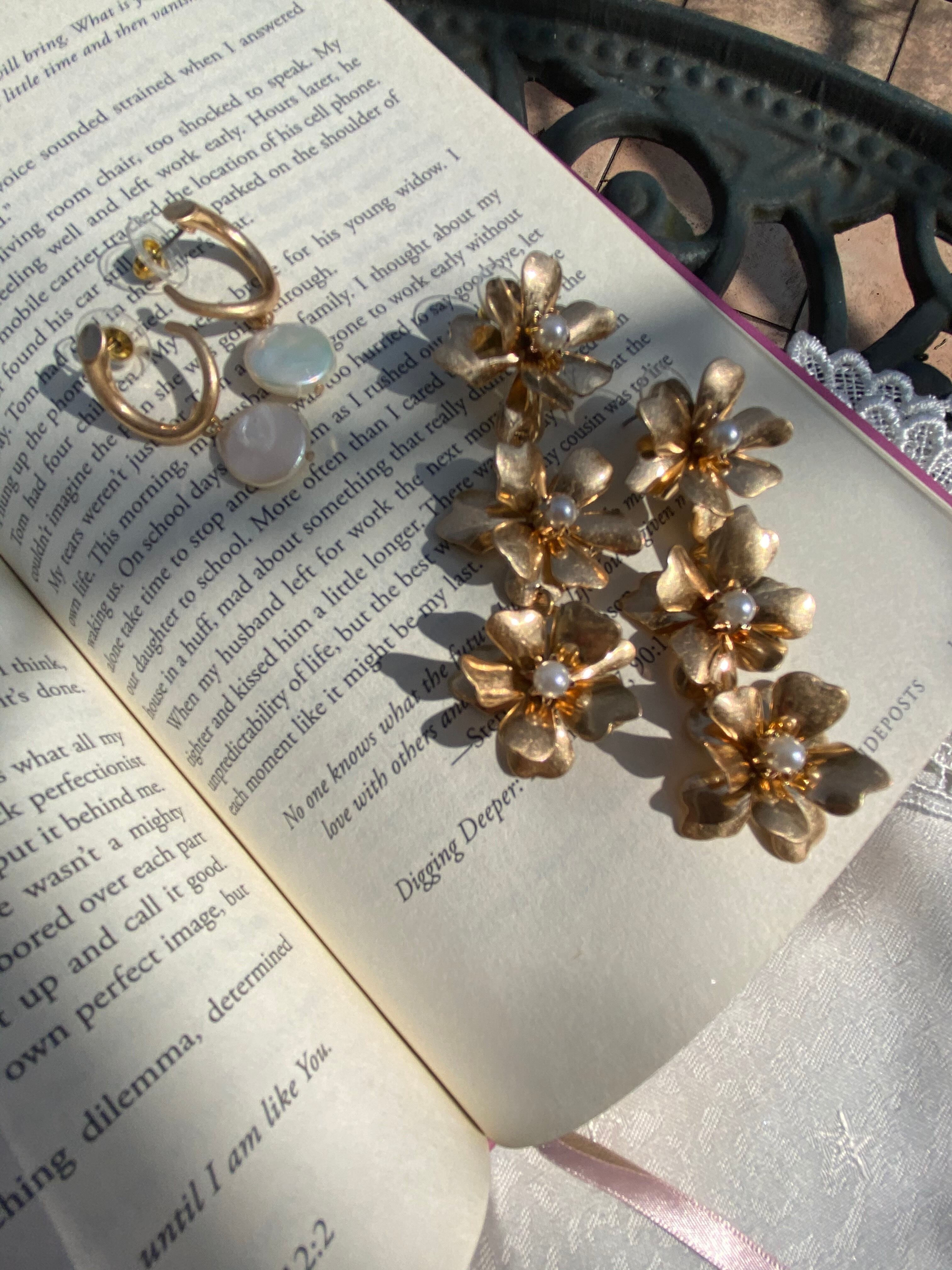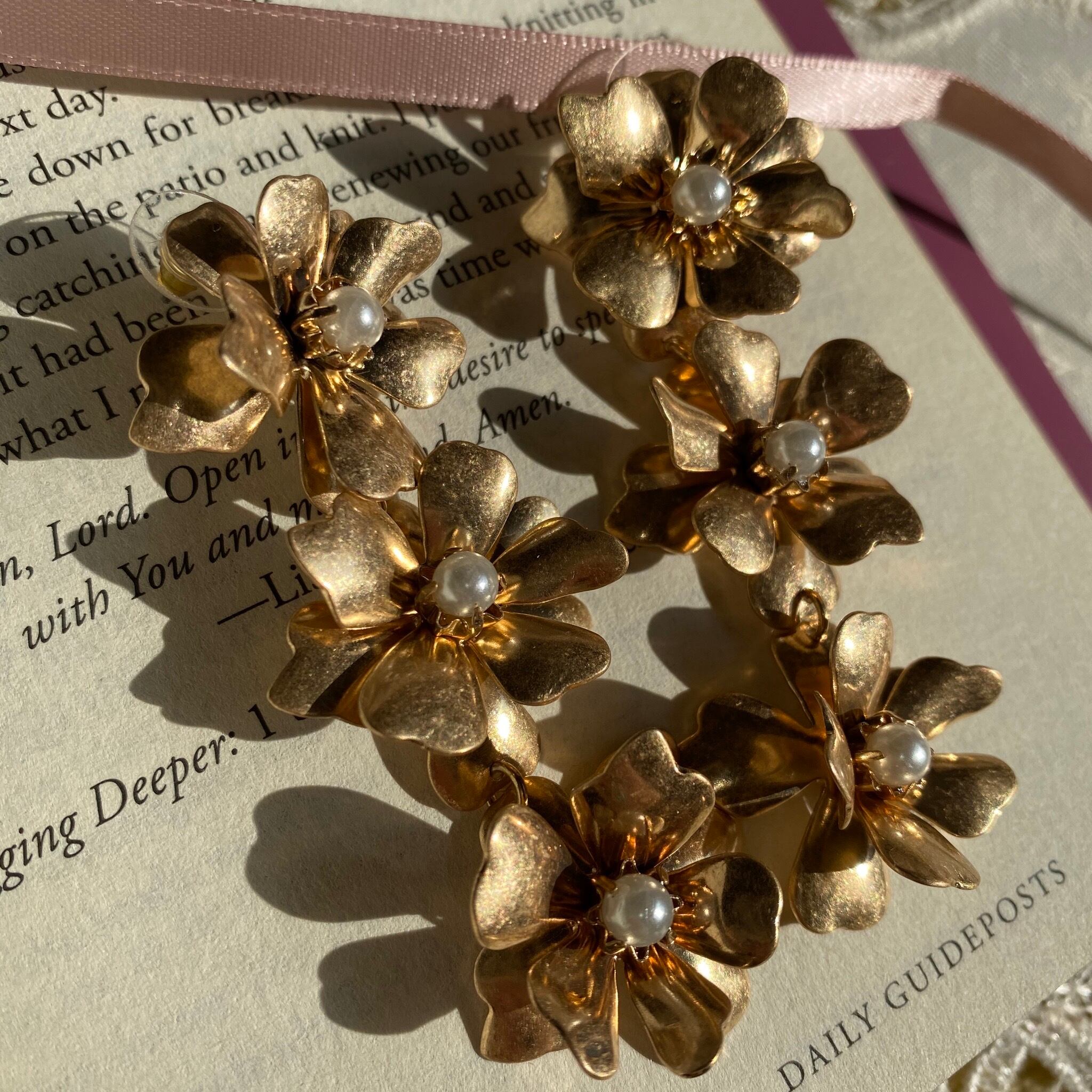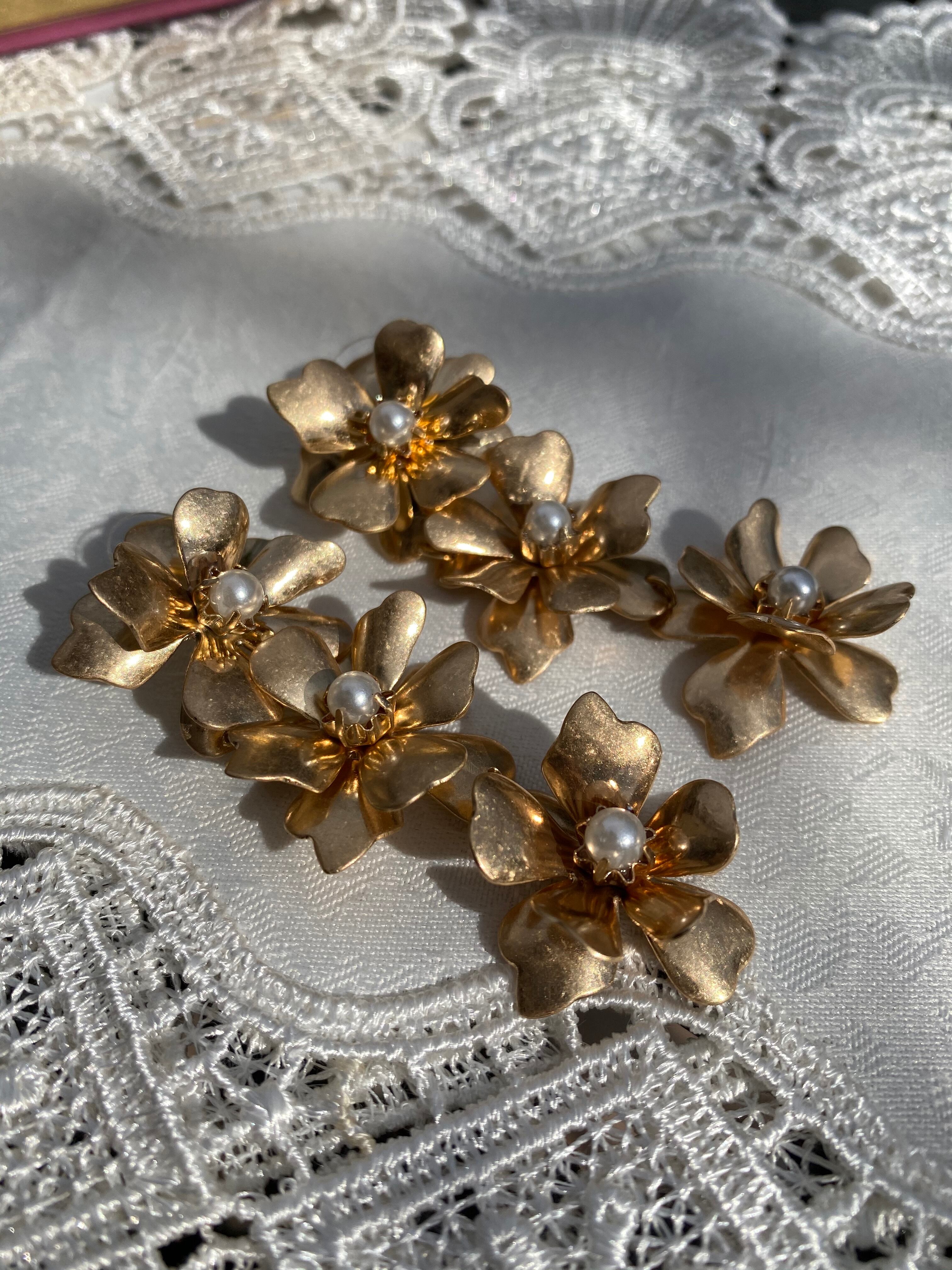 ビンテージ感のあるゴールドのフラワーが3連になったピアスです。