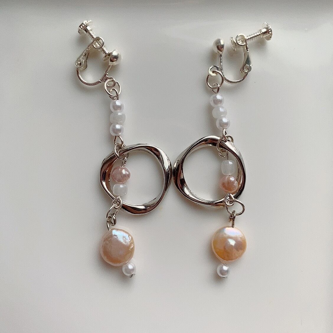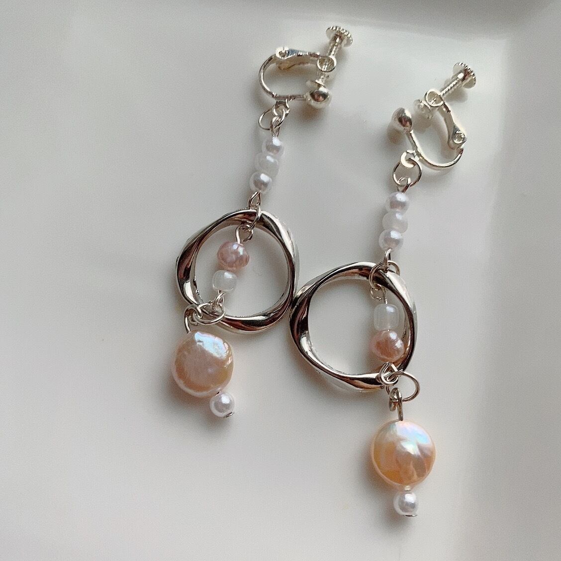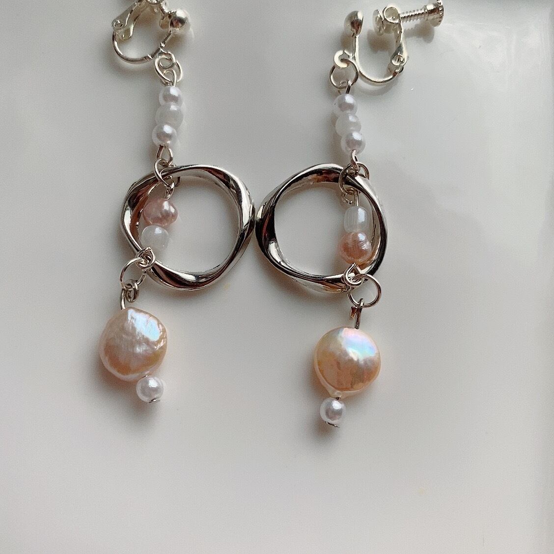ゆらゆらゆれるたびに、ピンクやオレンジの淡水パールがキラキラと光ります。