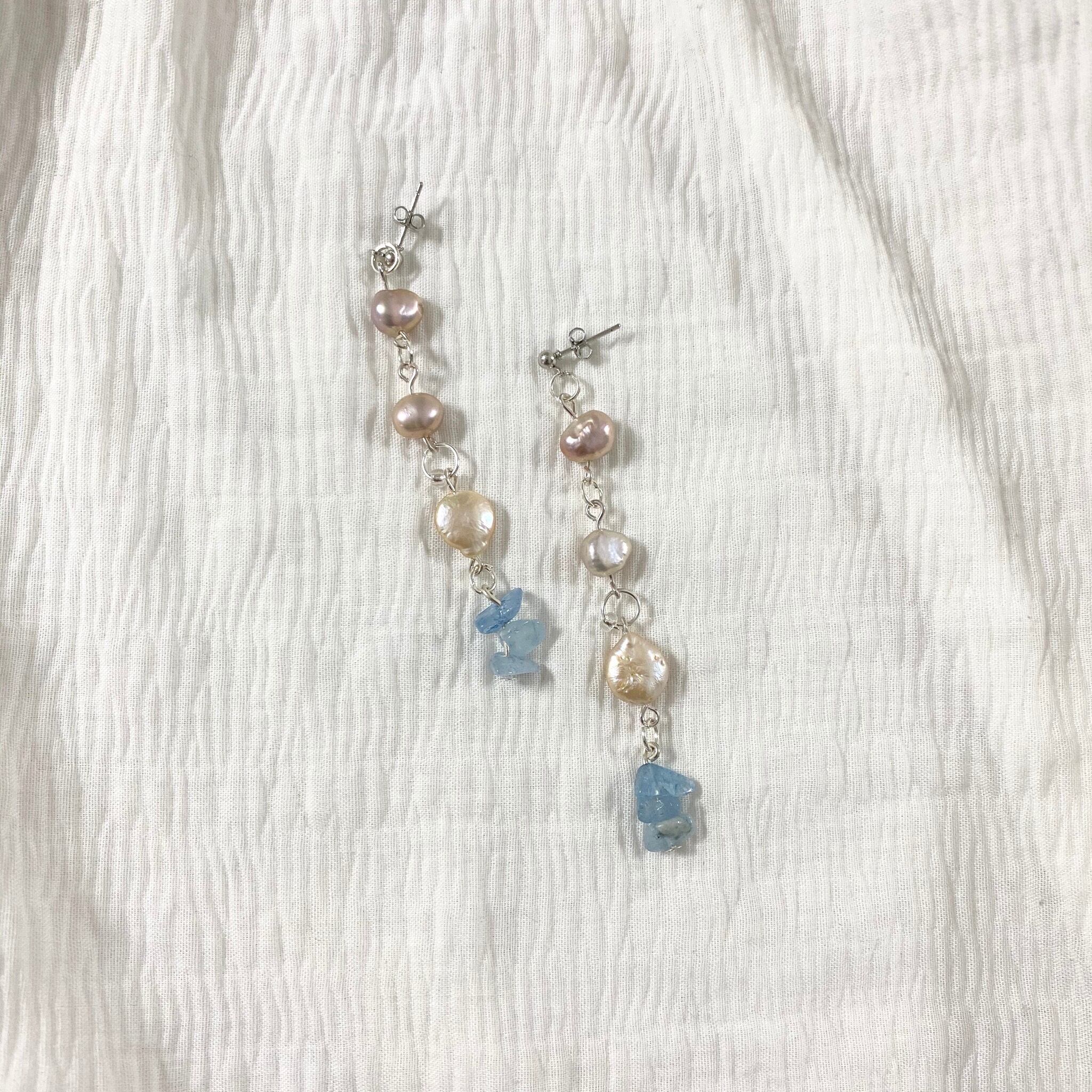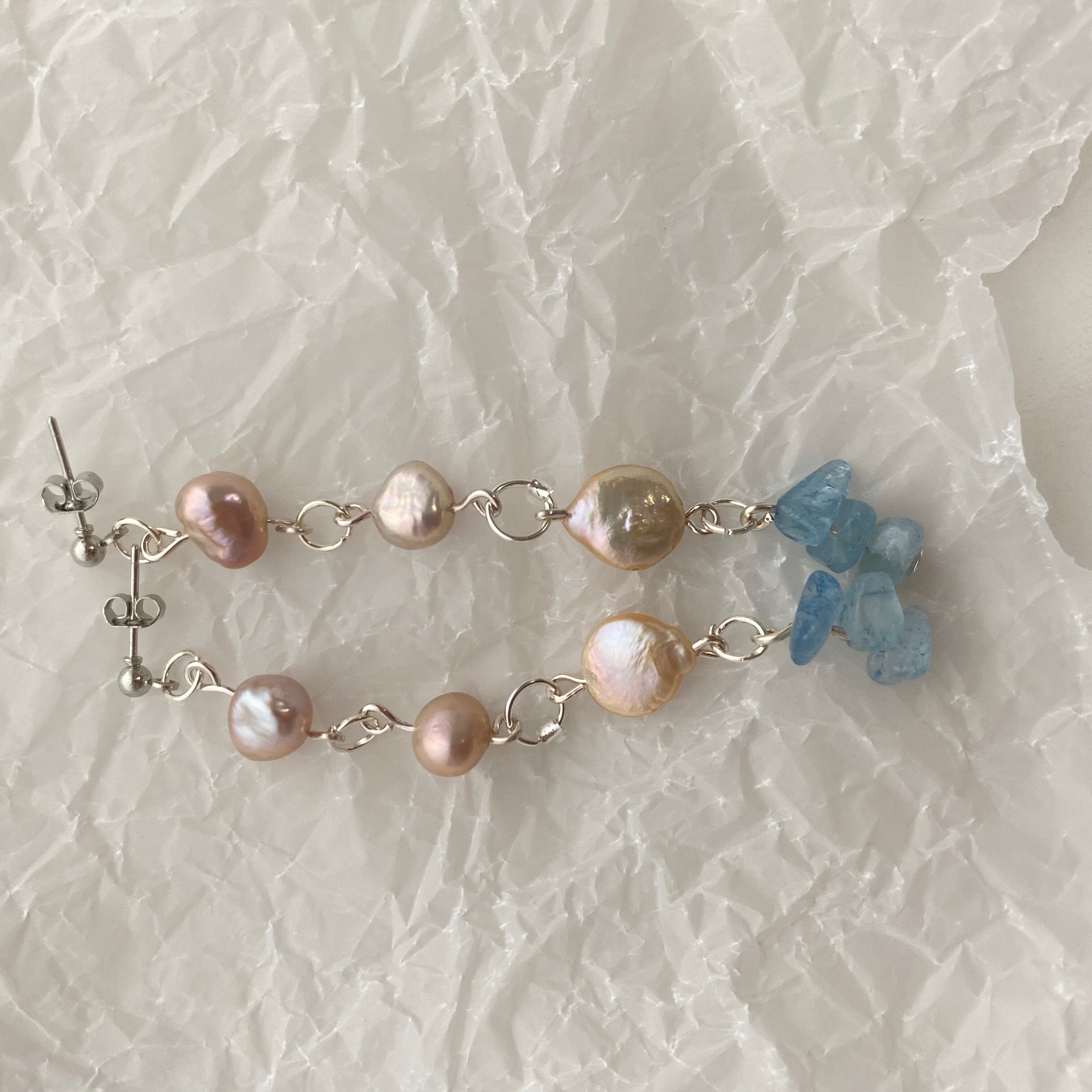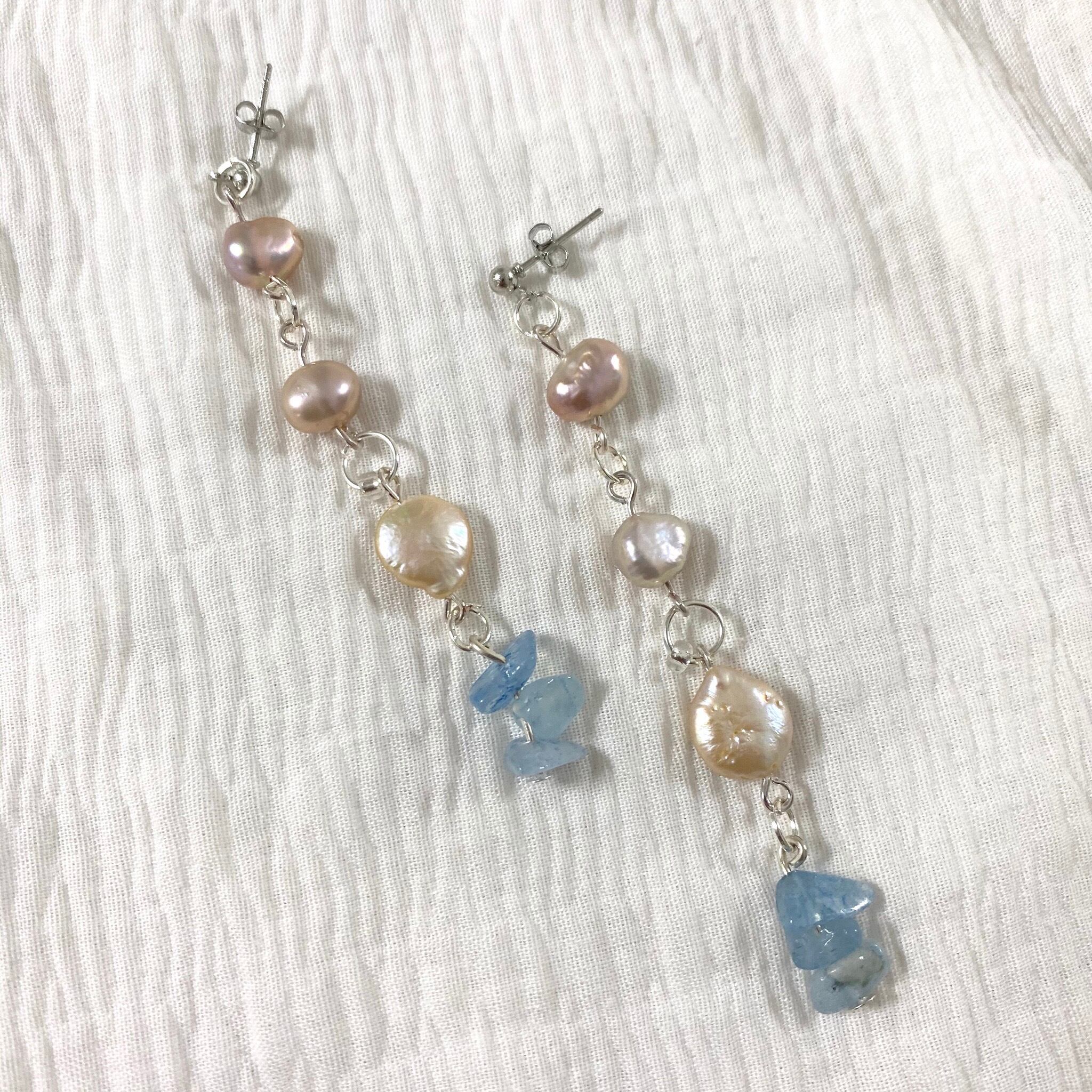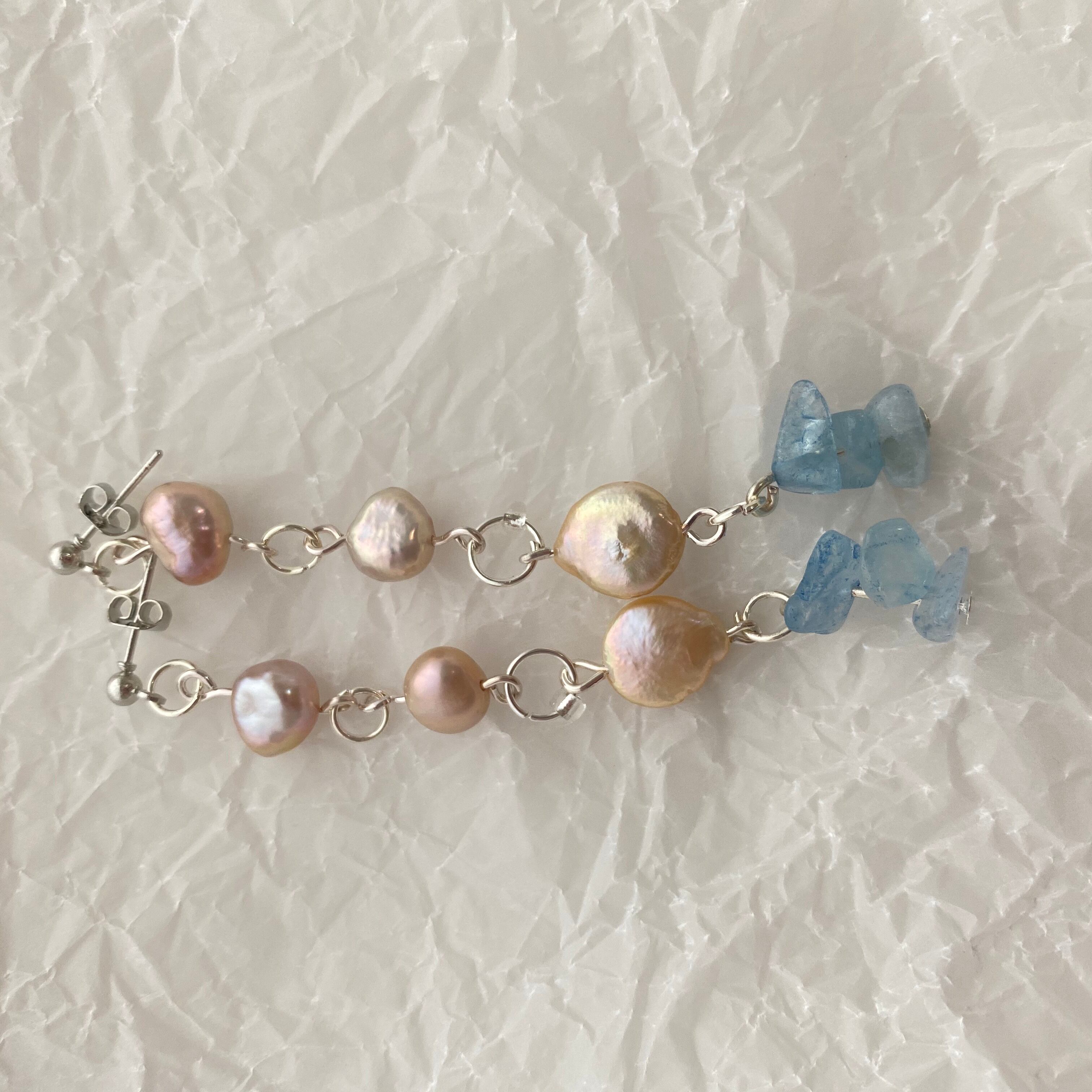 ピンクとオレンジの淡水パールとアクアマリンピアス