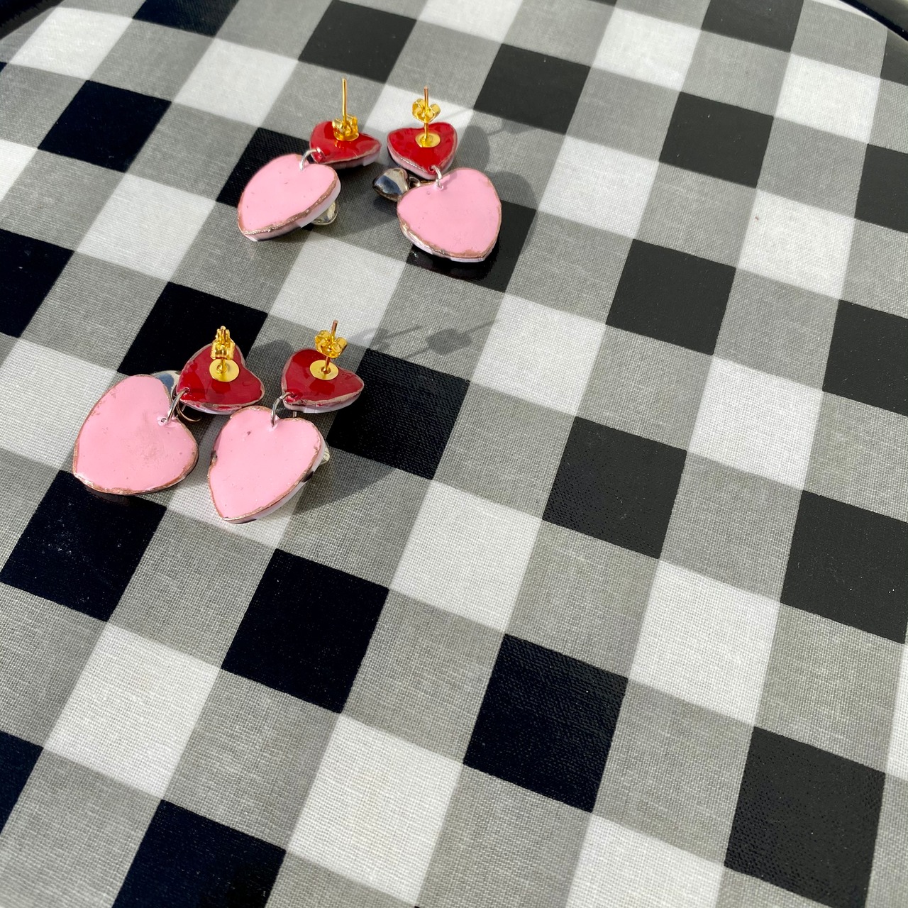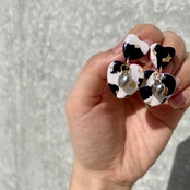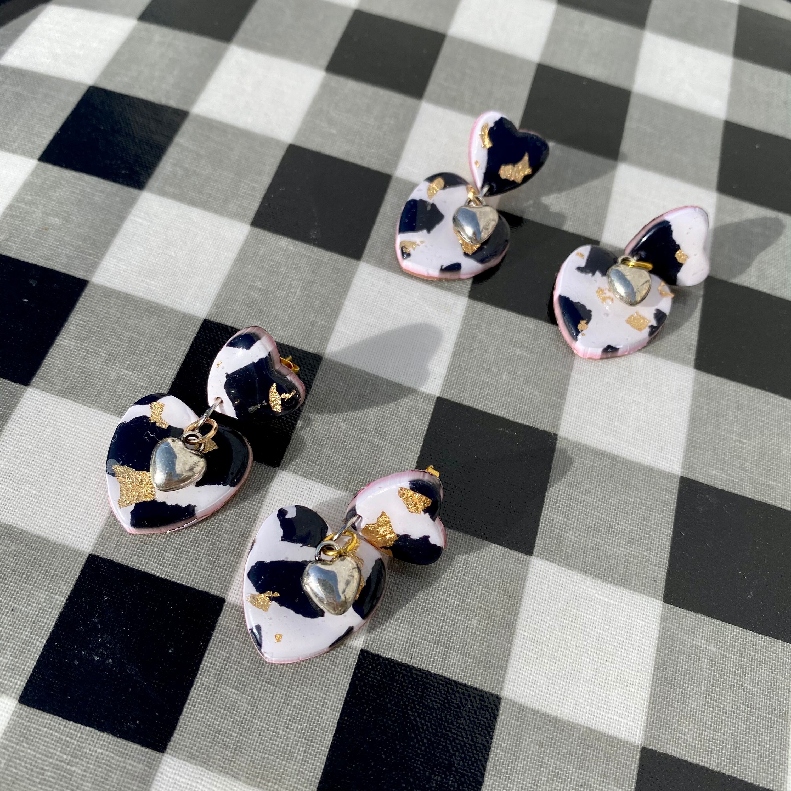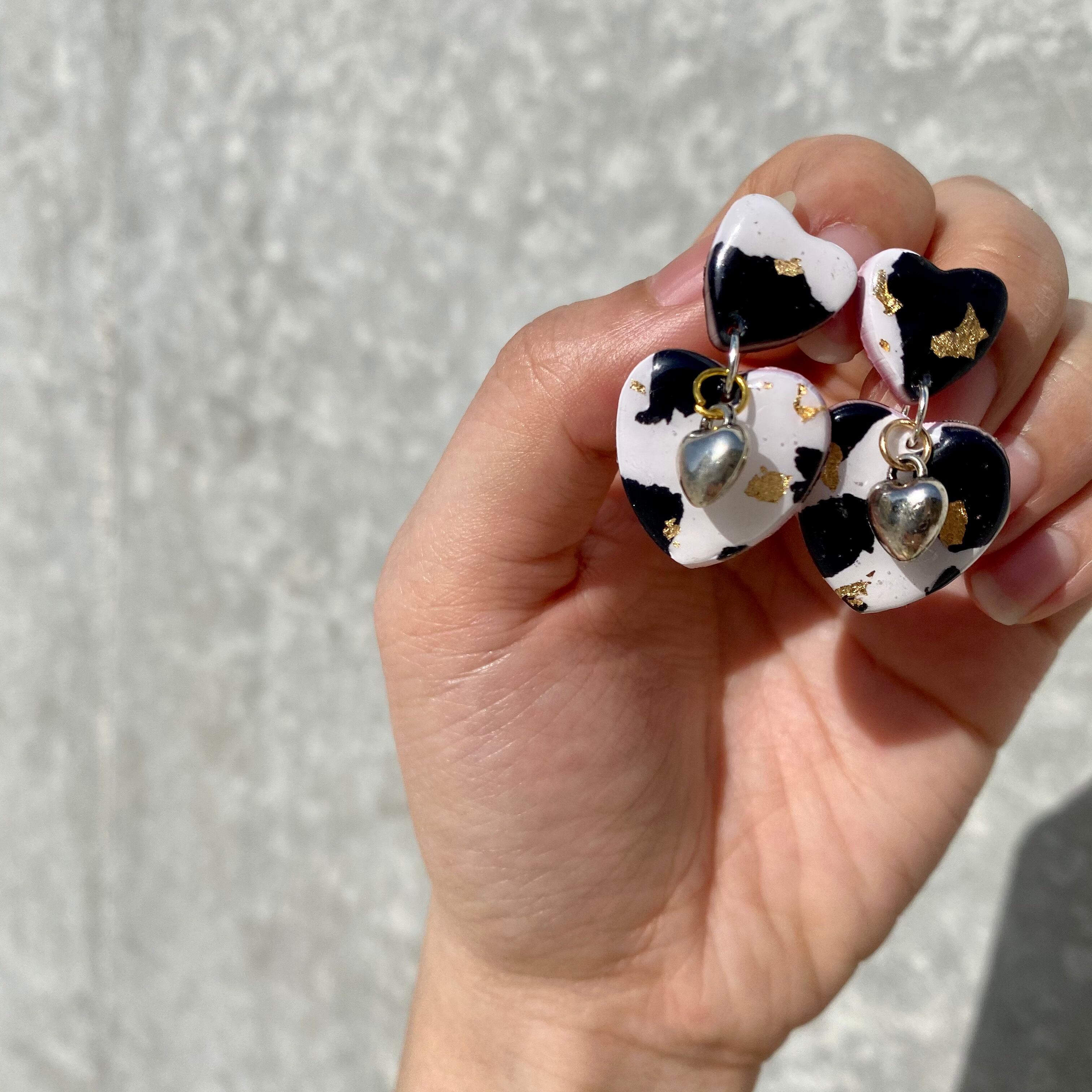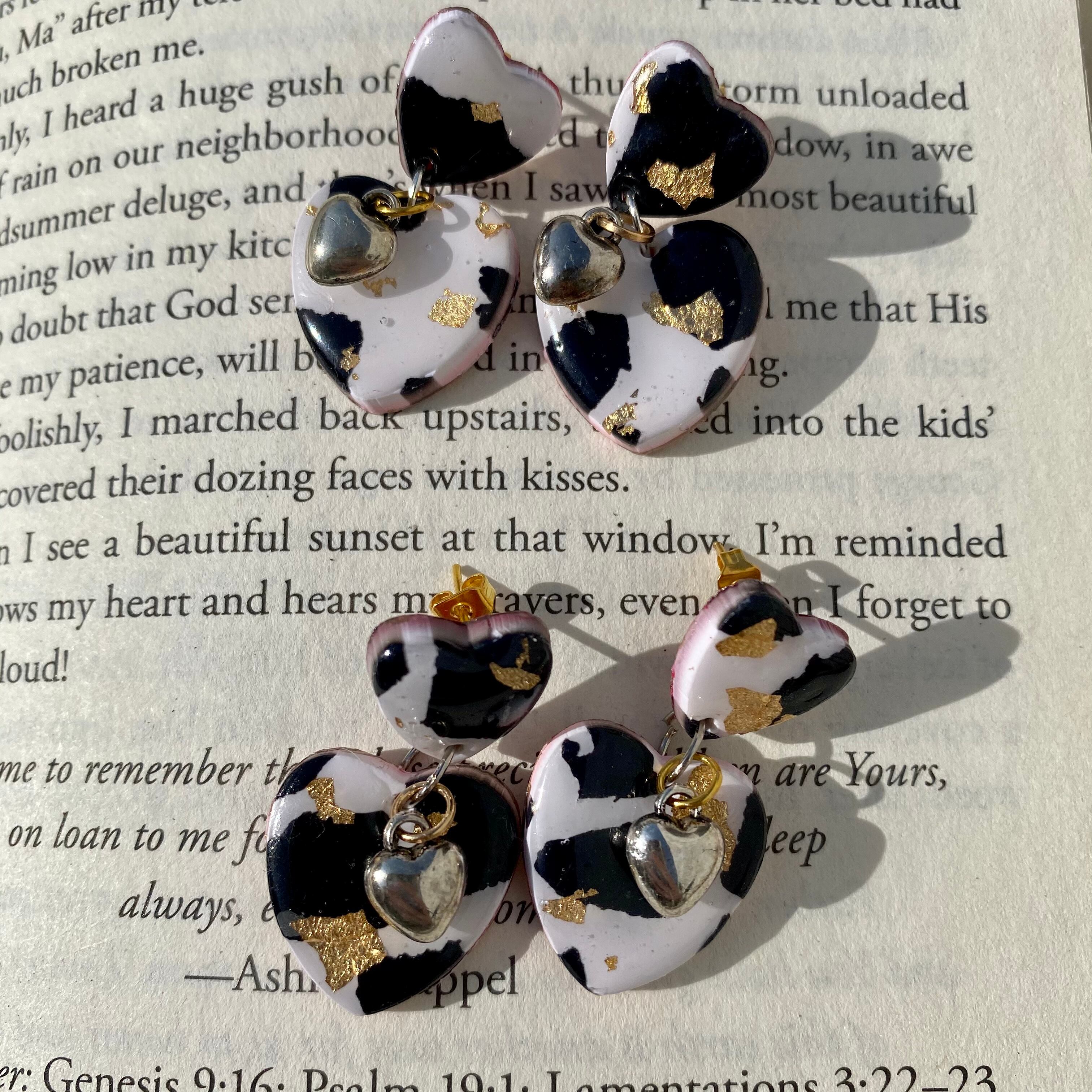 ゆらゆらゆれるハートの牛柄ビーズとハートのチャームが