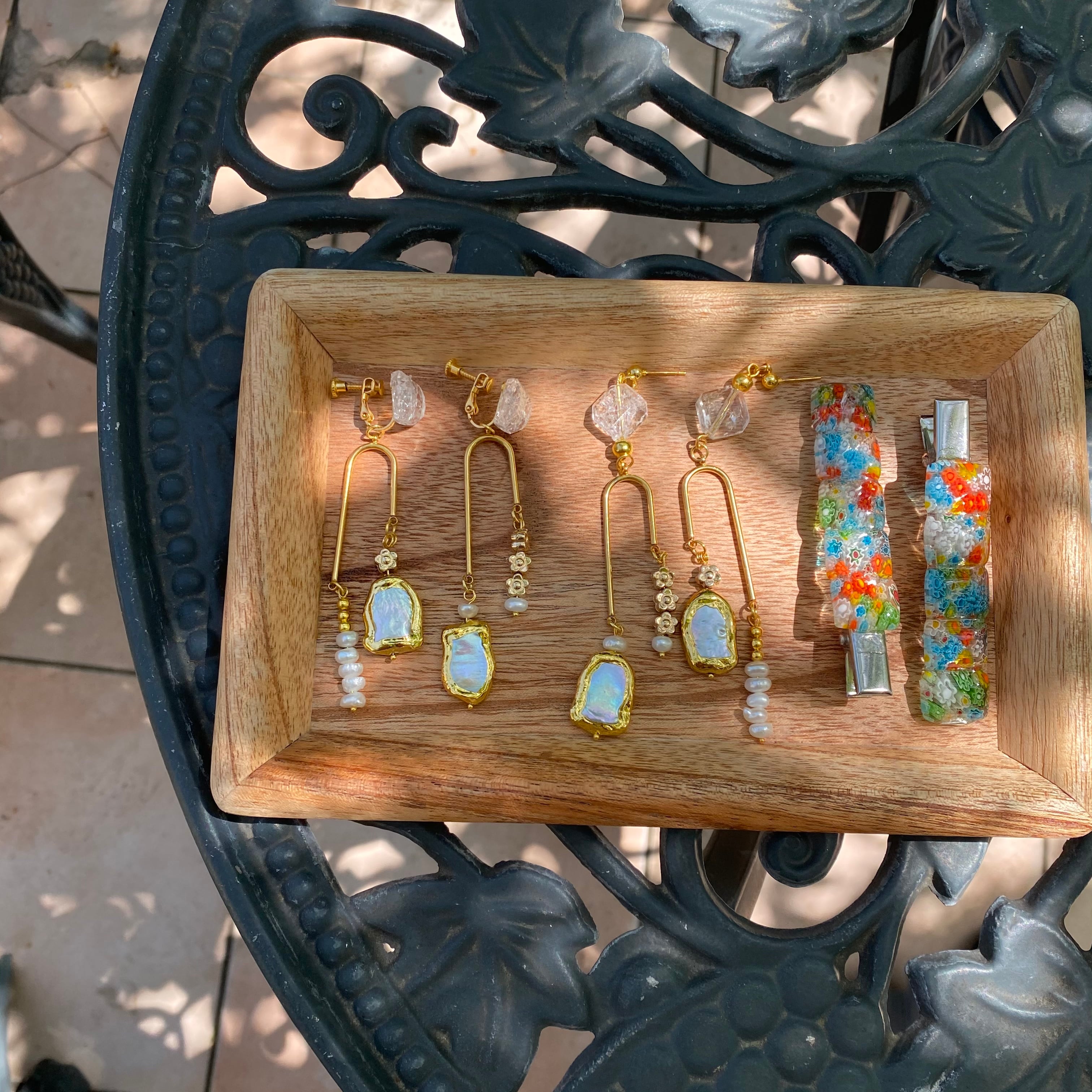 小さな淡水パールやゴールドのフラワーを